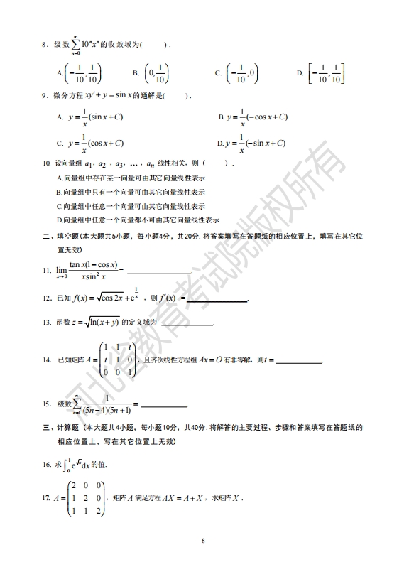 河北省普通高等學校專升本考試 高等數學 (二) (經管、農學類) 模擬試卷 1