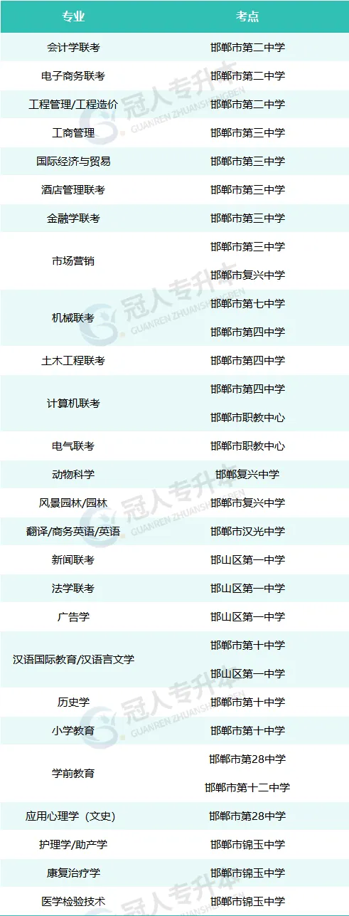 2025年河北邯鄲專升本考試地點匯總:參加2025年河北專升本考試的考生可以參考下表中邯鄲地區的專升本考點,就近選擇考試地點。