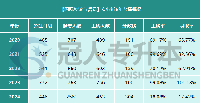 24年河北專升本國(guó)際經(jīng)濟(jì)與貿(mào)易專業(yè)招生446人,99分以上人數(shù)為2561人,上線人數(shù)為463人,分控線為304分