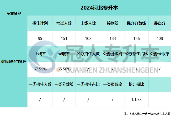 2025年河北省專升本考試將與2025年4月19日進行,河北專升本考試健康服務與管理專業錄取率還沒有公布,參加2025年河北專升本考試的考生可以參考下表中2024年健康服務與管理專