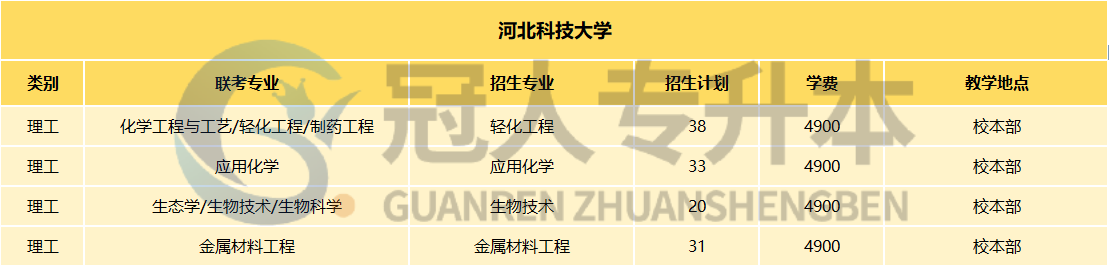 河北科技大學24年統招專升本共招生122人,均為理工類專業。24年招生人數最多的是輕化工程專業38人,招生最少的是生物技術專業20人。河北科大統招專升本的教學地點均為校本部。